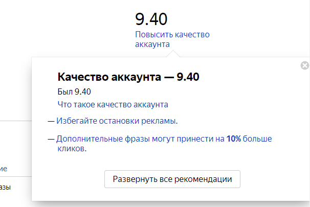 Справа пример показателя качества одного из аккаунтов, для которого мы настраивали Яндекс.Директ (9.4 балла из 10 возможных):
